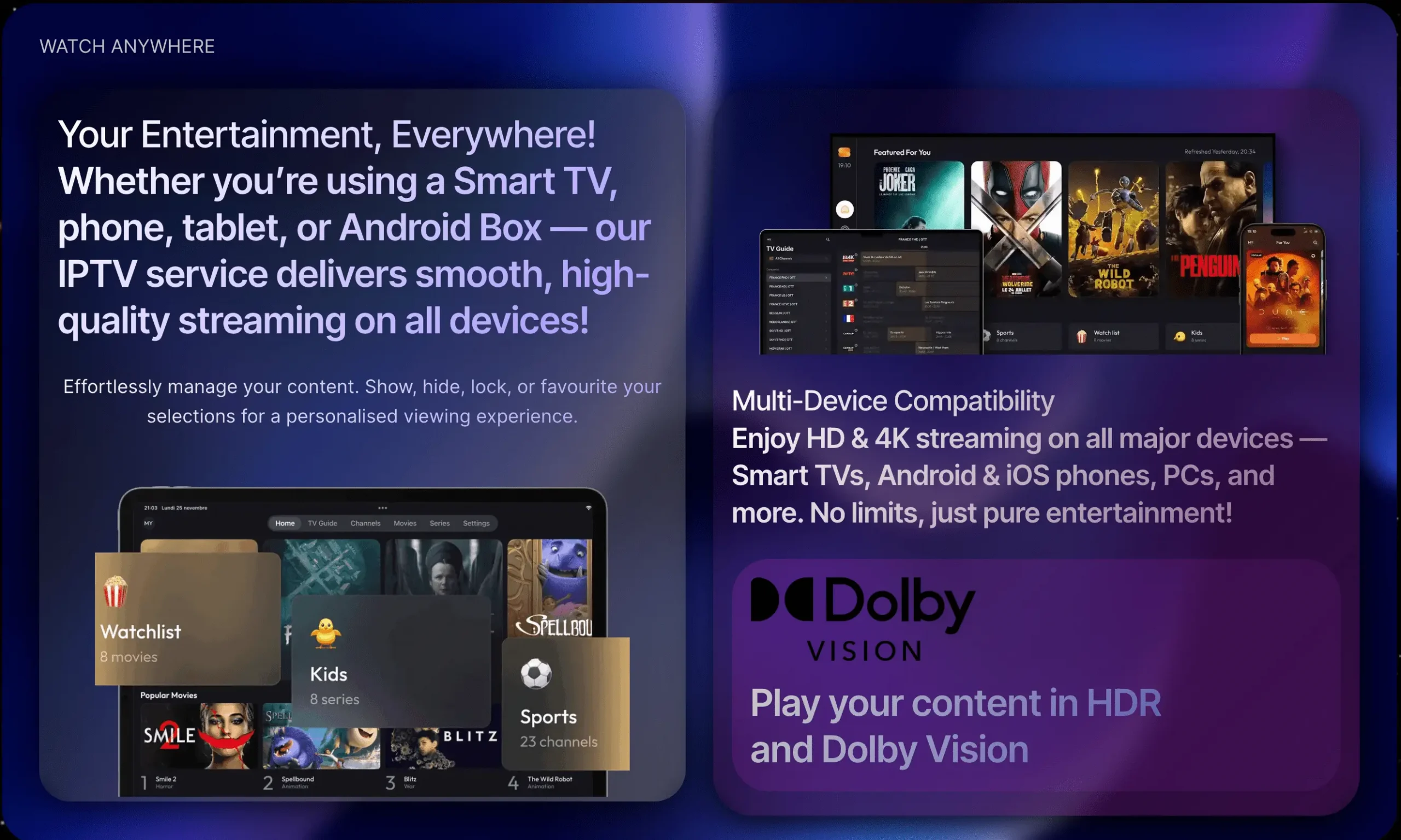 Whether you’re using a Smart TV, phone, tablet, or Android Box — our IPTV service delivers smooth, high-quality streaming on all devices!